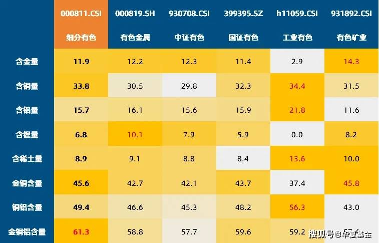 对比全市场主流的有色金属指数,各指数基本都覆盖在工业金属、小金属、贵金属、能源金属四大细分板块,差异主要体现在黄金、锂、稀土等方面,其中细分有色指数在黄金、铜、铝的合计含量最高达到61.3%。