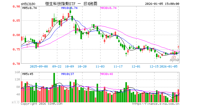 1月5日,恒生科技指数ETF(513180)涨3.69%,成交额51.12亿元。当日份额减少4.96亿份,最新份额为661.12亿份,近20个交易日份额增加26.51亿份。最新资产净值计算值为504.70亿元。