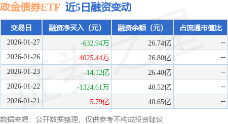 证券之星消息,1月27日,政金债券ETF(511520)融资买入5749.08万元,融资偿还6382.02万元,融资净卖出632.94万元,融资余额26.74亿元。