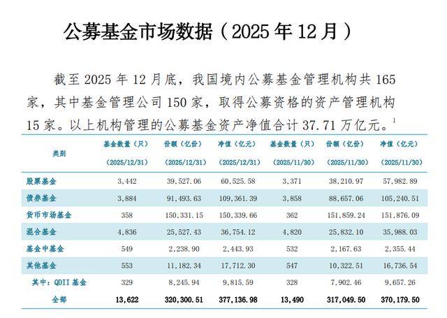 1月28日,中基协发布的公募基金市场数据显示,截至2025年12月底,我国境内公募基金管理机构共165家,其中基金管理公司150家,取得公募资格的资产管理机构15家。以上机构管理的公募基金资产净值合计37.71万亿元,这是我国公募基金总规模在2025年第九次创下历史新高。
