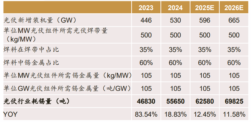 光伏领域同样带动锡需求。1 兆瓦光伏组件需要锡金属约 105 千克,ITA 数据显示,1 兆瓦光伏电池所需光伏焊带约 500 千克,其中焊料占焊带重量的 35%,且主流焊料中锡占比约 60%。 2025 年光伏行业用锡量将达到 6.3 万吨,2026 年增至 7.0 万吨,成为锡需求的重要增长点。