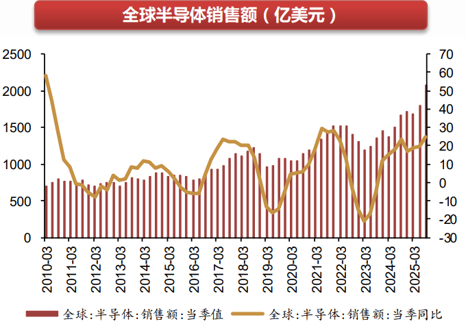 2025 年 3 月,全球半导体销售额为 1677 亿美元,同比增长 21.8%。作为半导体核心组成部分, 截至 2025 年 12 月,我国集成电路累计产量 4843 亿块,同比增长 10.9%。