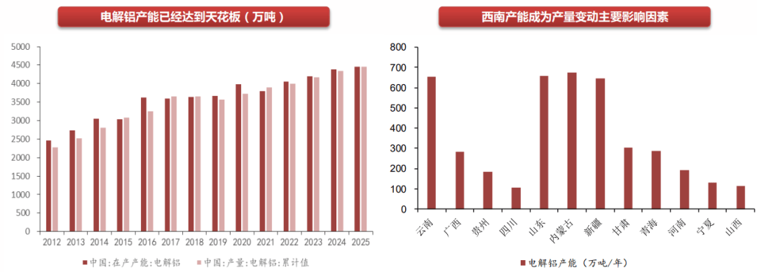 国内电解铝产能已触及 4500 万吨的上限,产量波动主要受西南地区水电供应影响。