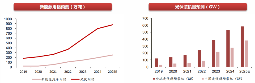 按照 2025 年全球光伏新增装机 583GW、国内新能源汽车产量增速 30%、单车用铝 150kg 测算,当年新能源领域铝消费占比将提升至 24%。