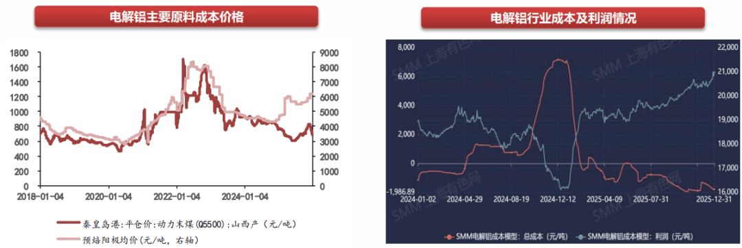 电解铝的核心原料成本由氧化铝、能源、预焙阳极构成。国内氧化铝和预焙阳极市场供应过剩,价格主要跟随自身生产成本变动, 2025年以来这两类原料价格持续走低,叠加能源价格下行,电解铝的生产成本不断下降。据 SMM 数据,2025 年电解铝行业平均利润保持在每吨 3836 元以上。