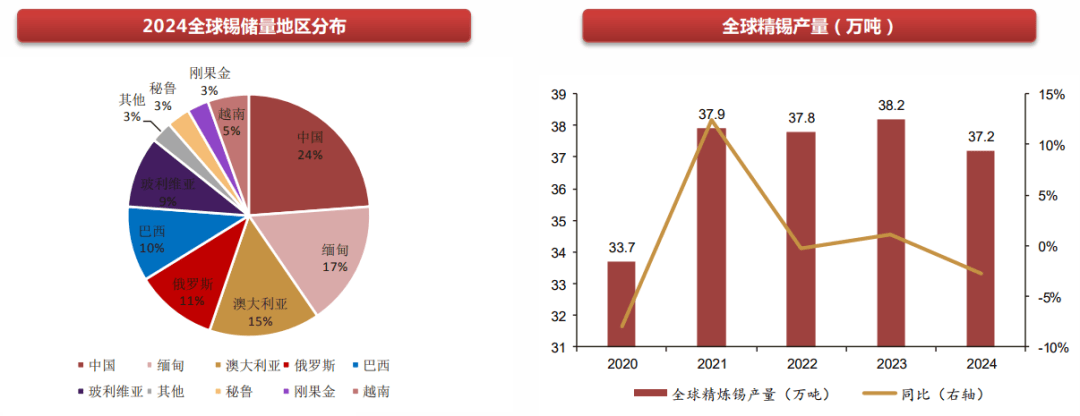 根据 2024 年的数据,全球这块 “蛋糕” 总储量约 420 万吨, 其中中国占了 100 万吨,以 23.8% 的份额成为全球第一大锡储量国,缅甸和澳大利亚则分别以 70 万吨、62 万吨的储量排在第二、第三位。
