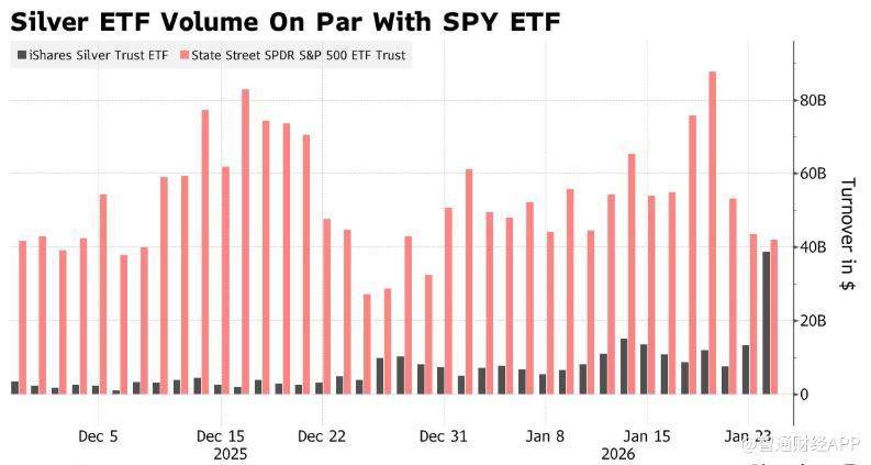 白银价格近期出现极端上涨行情,推动相关交易产品成交量急剧飙升。iShares Silver Trust白银交易型开放式指数基金(SLV.US)周一录得接近400亿美元的成交额,交易活跃度大幅攀升。