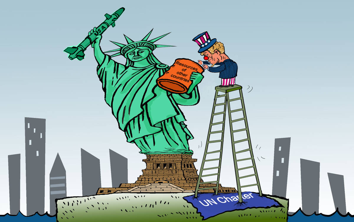 美国践踏联合国宪章,肆意掠夺他国资源,其自由民主形象尽毁。(来源:中国日报 杨良义 英文《中国日报》2026年1月29日8版)