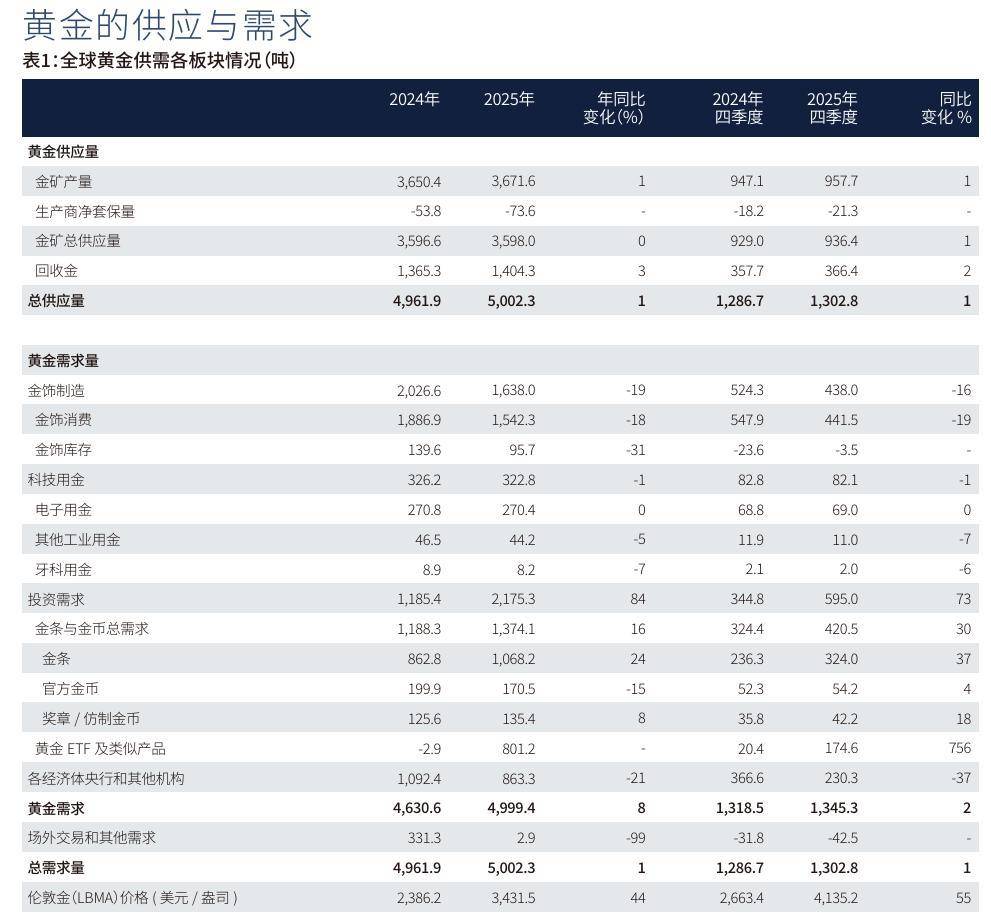 具体来看,全球黄金投资需求增至2175吨的里程碑水平,成为推动2025年黄金总需求刷新历史纪录的主要驱动力。全球范围内,寻求避险和资产多元化的投资者大量涌入黄金ETF,全年净增801吨,成为历史第二高年度增量。