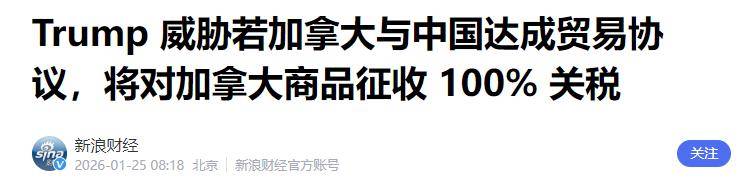 1月24日,就在加拿大总理马克·卡尼结束对中国为期四天的正式访问后仅仅一周,美国总统特朗普便在社交媒体上发难,直指中加两国刚刚达成的经贸合作意向,并以加征关税作为直接威胁手段。
