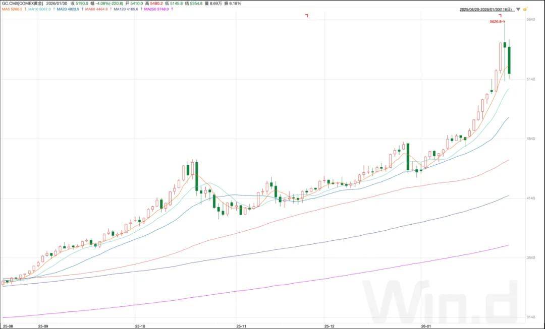 从价格维度来看,金价上涨的直观感受更为强烈。以COMEX黄金为例,从2025年最后一个交易日报收4361美元/盎司开始,金价持续冲高,至1月29日盘中创下5627美元/盎司的历史新高,短短1个月不到的时间,国际金价涨幅超过了1300美元/盎司。