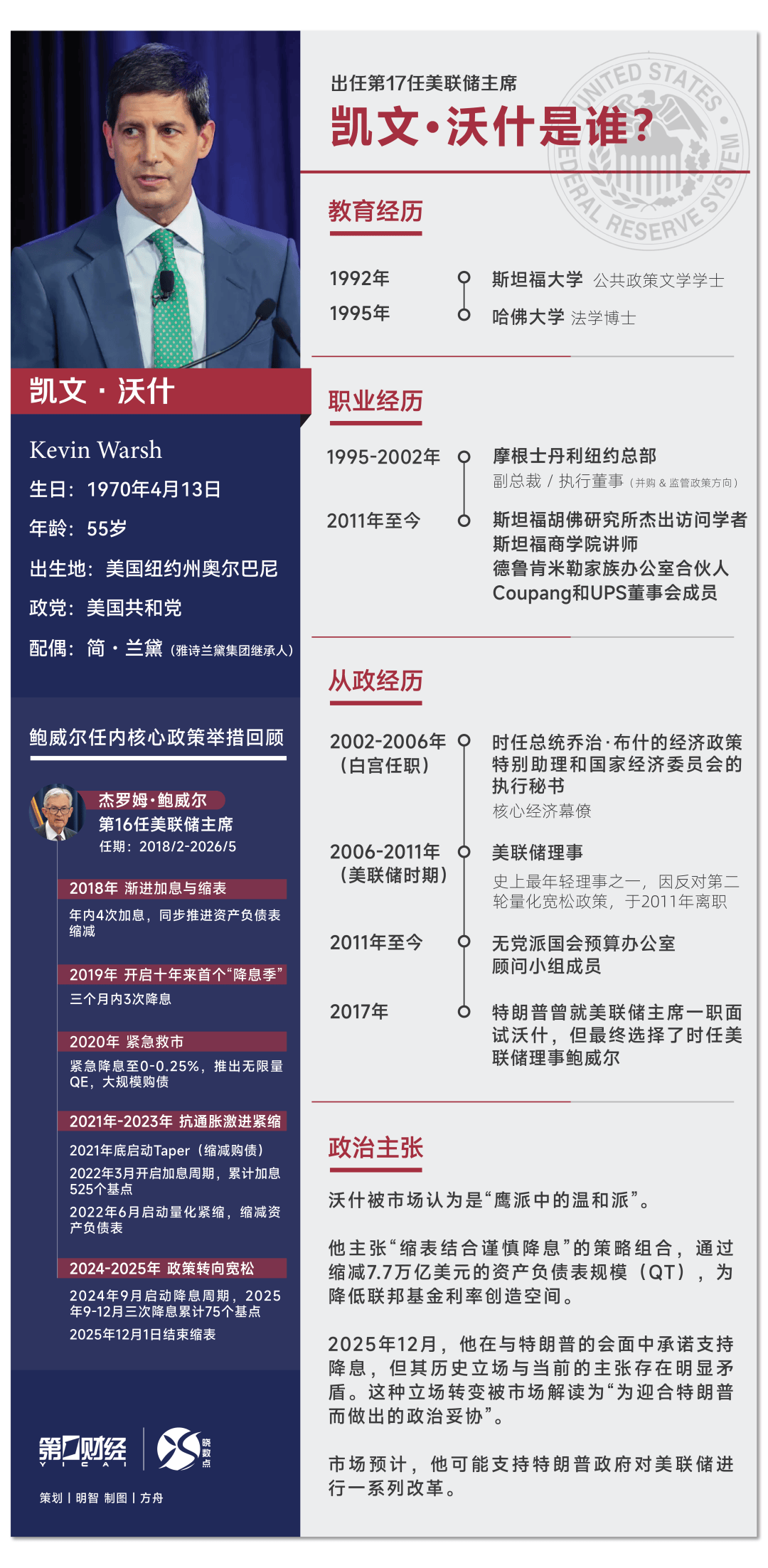 沃什2006年加入美联储,是当时最年轻的美联储理事。在美联储任职期间,沃什持鹰派货币政策立场,但近年转向支持特朗普的关税政策及加快降息立场。特朗普在首个总统任期内提名鲍威尔为美联储主席。当时,鲍威尔与沃什均为特朗普考虑的人选,但鲍威尔最终获得提名。