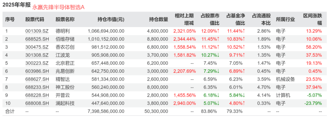 排在榜首的是张海啸管理的永赢先锋半导体智选混合发起A(025208.OF),听名字就知道,这只基金专注在半导体赛道,四季报显示其持仓主要聚焦在芯片领域。