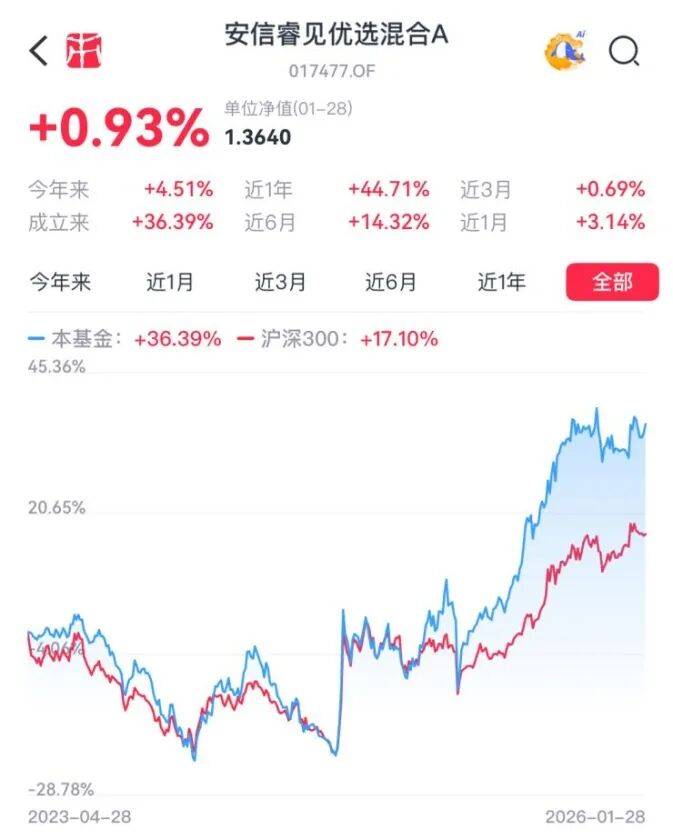此外,不少周期和资源主题产品受到资金青睐,比如邹立虎管理的景顺长城周期优选A(018504.OF),持仓主要集中在以有色为代表的周期股上,近些年在资源大行情下业绩表现也是相当不错。