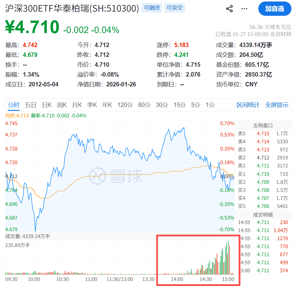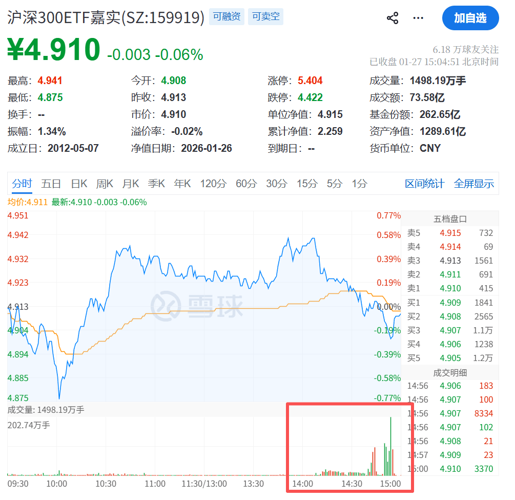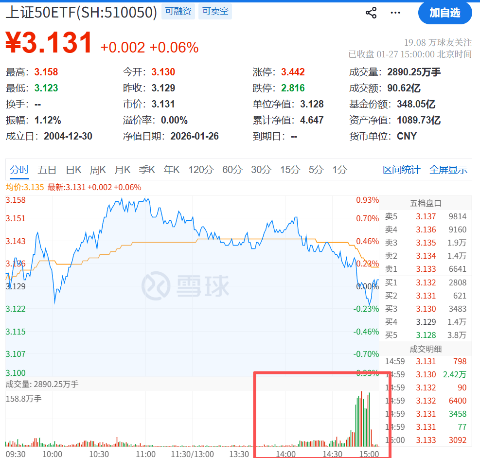 值得注意的是,上证50ETF及四大沪深300ETF,尾盘成交量都大幅上升。