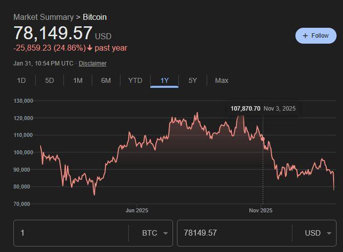 历史新低,比特币跌破80000... 2月1日,据媒体报道,比特币价格跌至自去年关税冲击以来的最低水平,其作为“数字黄金”的声誉正逐渐瓦解...