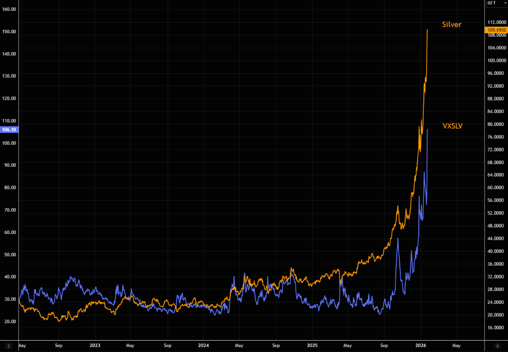 据LSEG Workspace数据,渴望入场的投资者以及空头正在恐慌性买入上行波动率期权。白银波动率指标VXSLSLV目前徘徊在106附近,盘中一度触及124,意味着市场正在为每日约7%的价格波动定价。这种波动率水平对于Meme股票而言已属极端,对于白银这类硬资产更是史无前例。