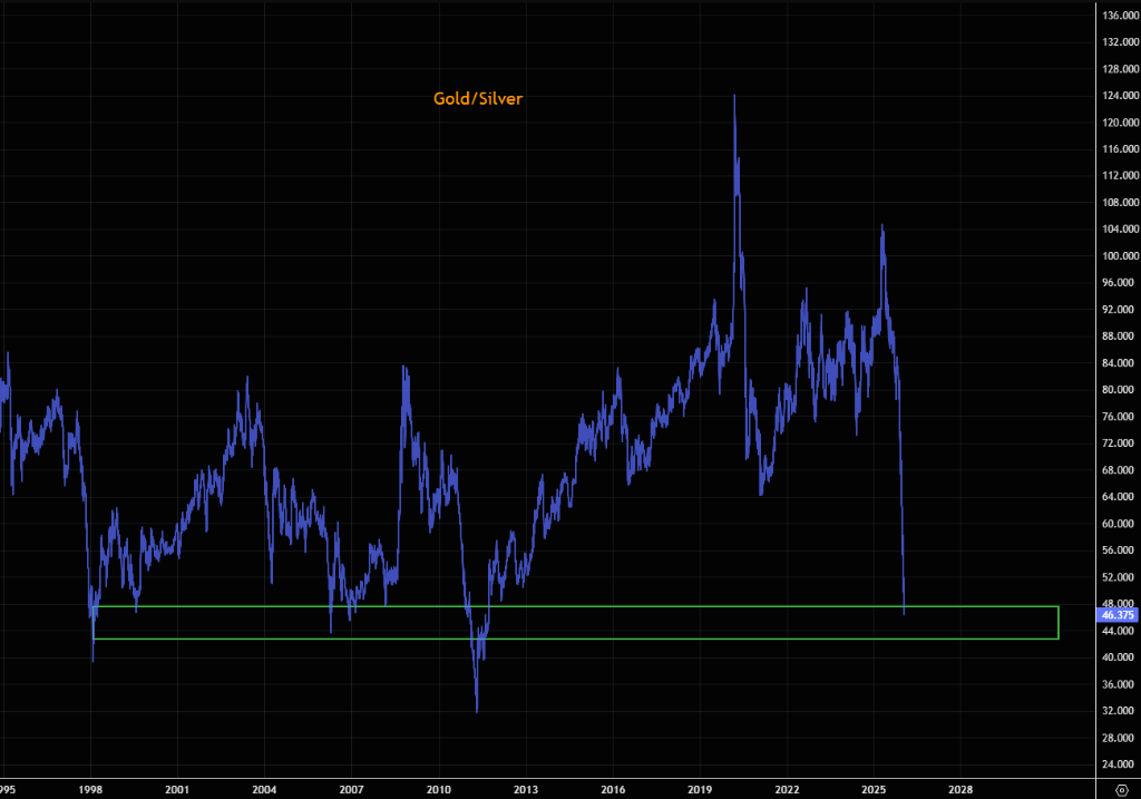随着白银价格的剧烈波动,金银比(Gold/silver ratio)已降至46的水平。这一比率正在进入关键的历史区间,通常被视为衡量贵金属相对估值的重要指标。金银比的快速收缩反映出白银在本轮贵金属行情中的表现显著优于黄金。