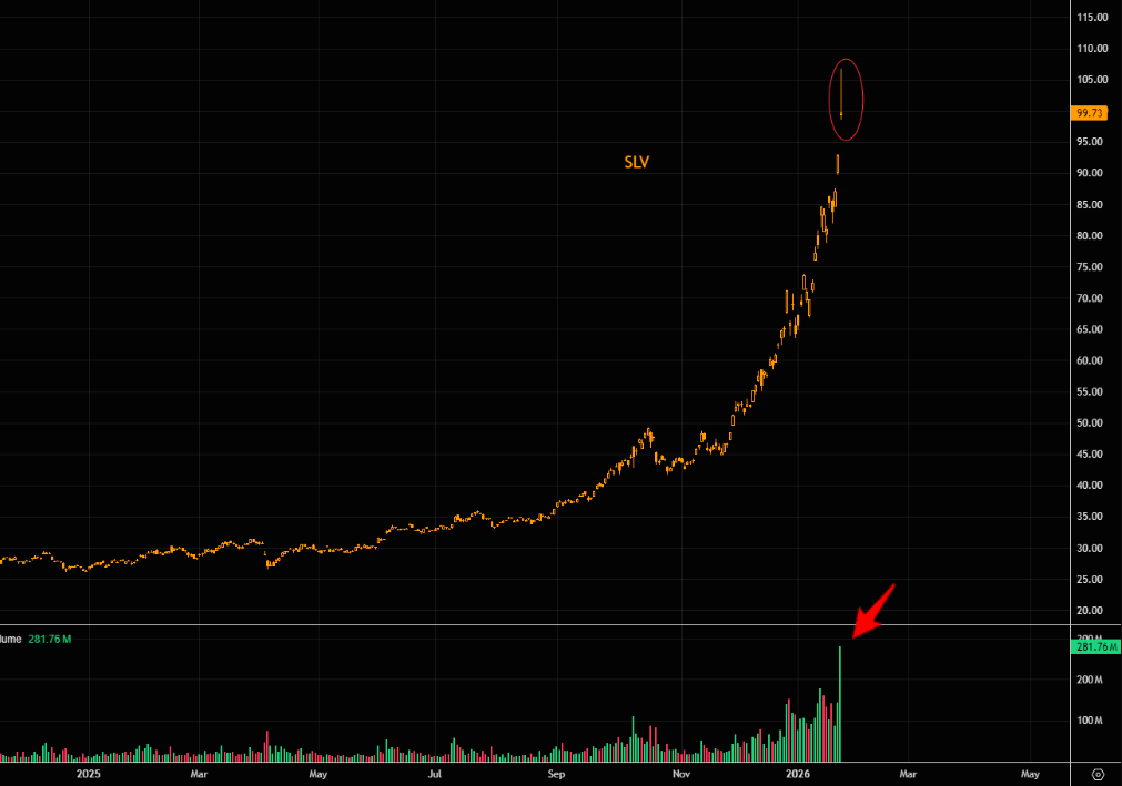白银ETF(SLV)周一成交量创下历史纪录,恐慌性追涨资金涌入市场。技术图表显示,白银在创纪录成交量下形成了巨大的"射击之星"K线形态,这通常被视为见顶信号。