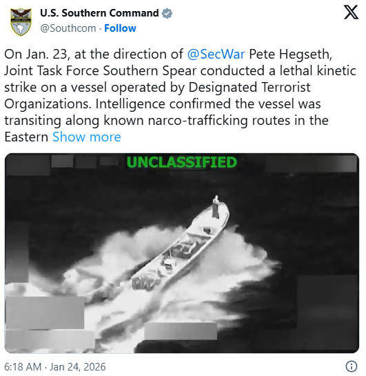 中新网1月24日电 当地时间23日,美国军方表示,已对一艘涉嫌在太平洋东部海域贩毒的船只发动致命打击。