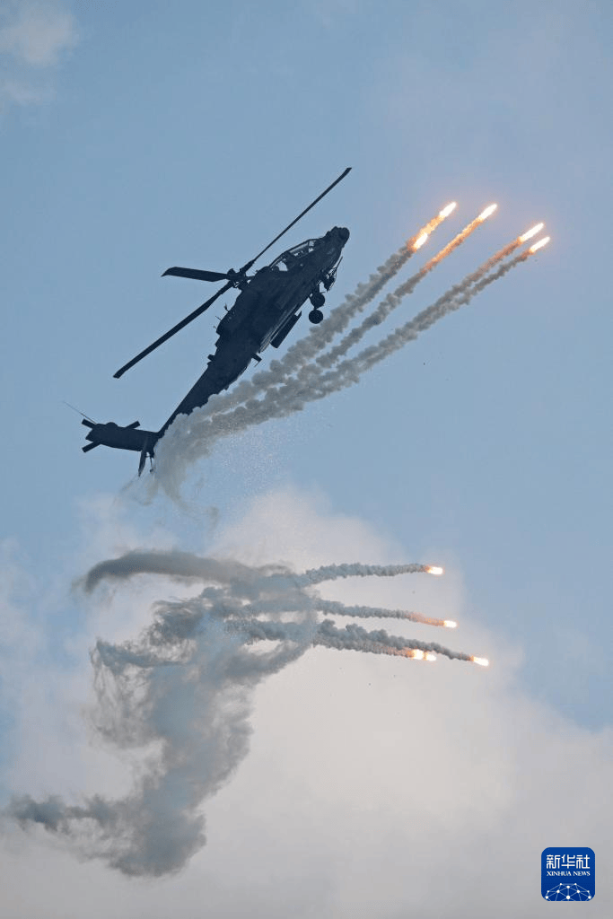 当地时间2026年2月1日,新加坡,在新加坡樟宜展览中心举行的新加坡航展媒体预演上,一架新加坡空军阿帕奇AH-64D直升机进行飞行表演。