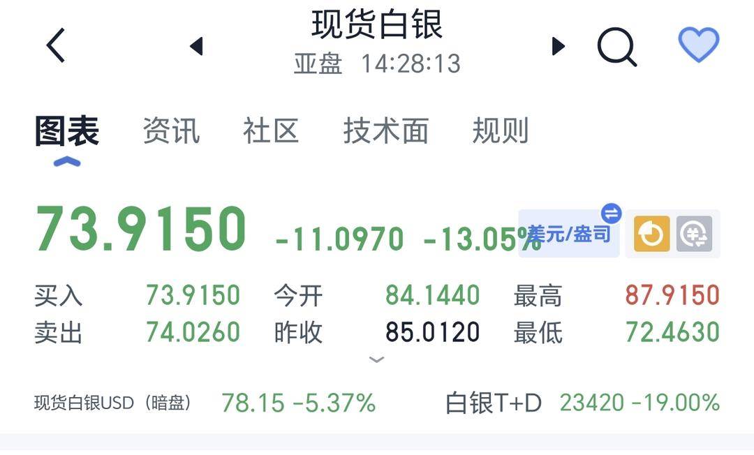 现货白银最低跌破73美元/盎司,日内跌逾11%。