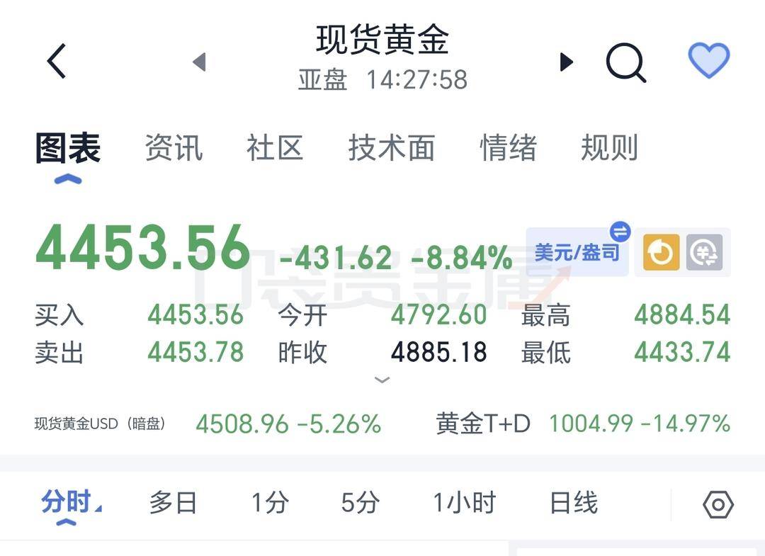 2月2日午后,现货黄金跌破4500美元/盎司,日内跌逾8%。