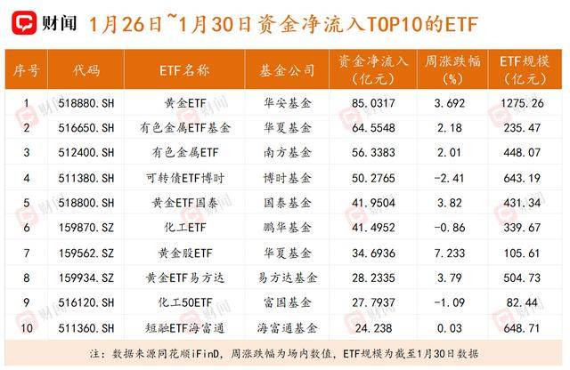 上周,在黄金及有色金属板块整体上涨、同时持续吸引资金净流入的双重推动下,华安基金旗下的黄金ETF(518880.SH)规模显著扩张,单周增长达139.47亿元,成为上周全市场唯一一只规模增量超百亿元的ETF。截至1月30日,其总规模已攀升至1275.26亿元。