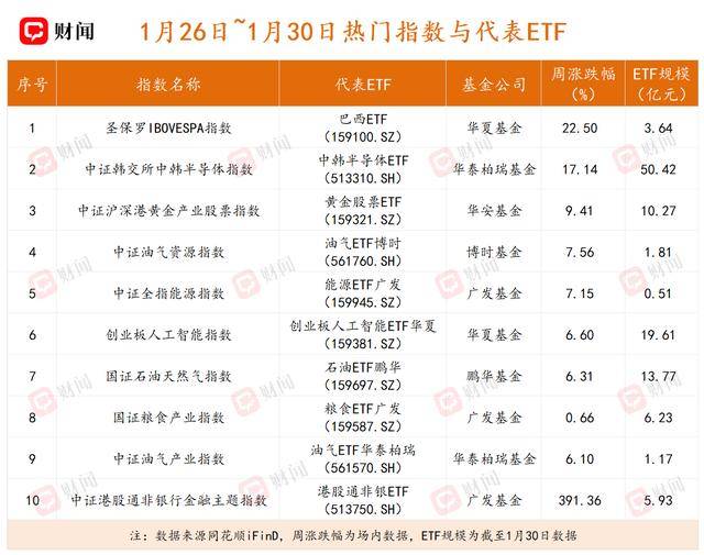 除贵金属外,全球油气资源价格上周同样显著上扬,不仅带动A股相关能源股走强,也助推了巴西ETF(159100.SZ)全周大涨22.50%,位居全市场ETF涨幅榜首。该基金跟踪圣保罗IBOVESPA指数,而该指数在当地时间1月29日创下历史新高