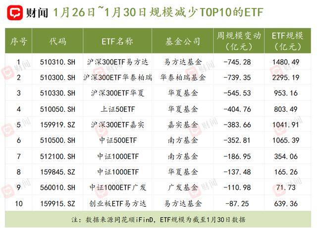 相比之下,宽基ETF则成为规模缩水最明显的类别。其中,沪深300ETF华泰柏瑞(510300.SH)在1月内规模从4000亿元级别大幅回落至2000亿元区间。截至1月30日,该基金规模为2295.1亿元,虽较月初明显下降,但仍稳居全市场首位,是目前唯一一只规模超过2000亿元的ETF产品。