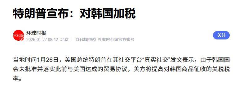 信息来源:特朗普宣布:对韩国加税 环球时报 2026-01-27 08:42