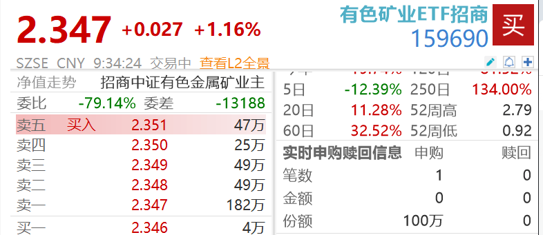 有色板块开盘强势,湖南白银、湖南黄金双双涨超5%,白银有色、紫金矿业、华锡有色、洛阳钼业等跟涨。有色矿业ETF招商(159690)涨1.16%。