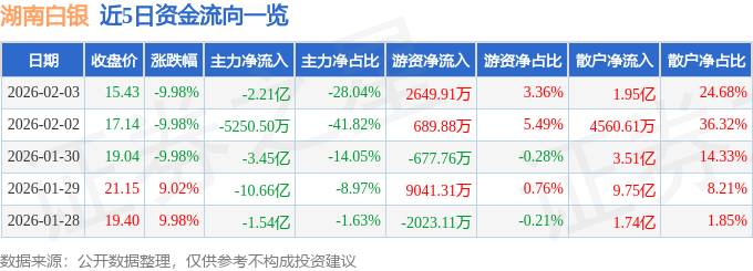 证券之星消息,截至2026年2月3日收盘,湖南白银(002716)报收于15.43元,下跌9.98%,已连续跌停3天,换手率2.2%,成交量51.12万手,成交额7.89亿元。