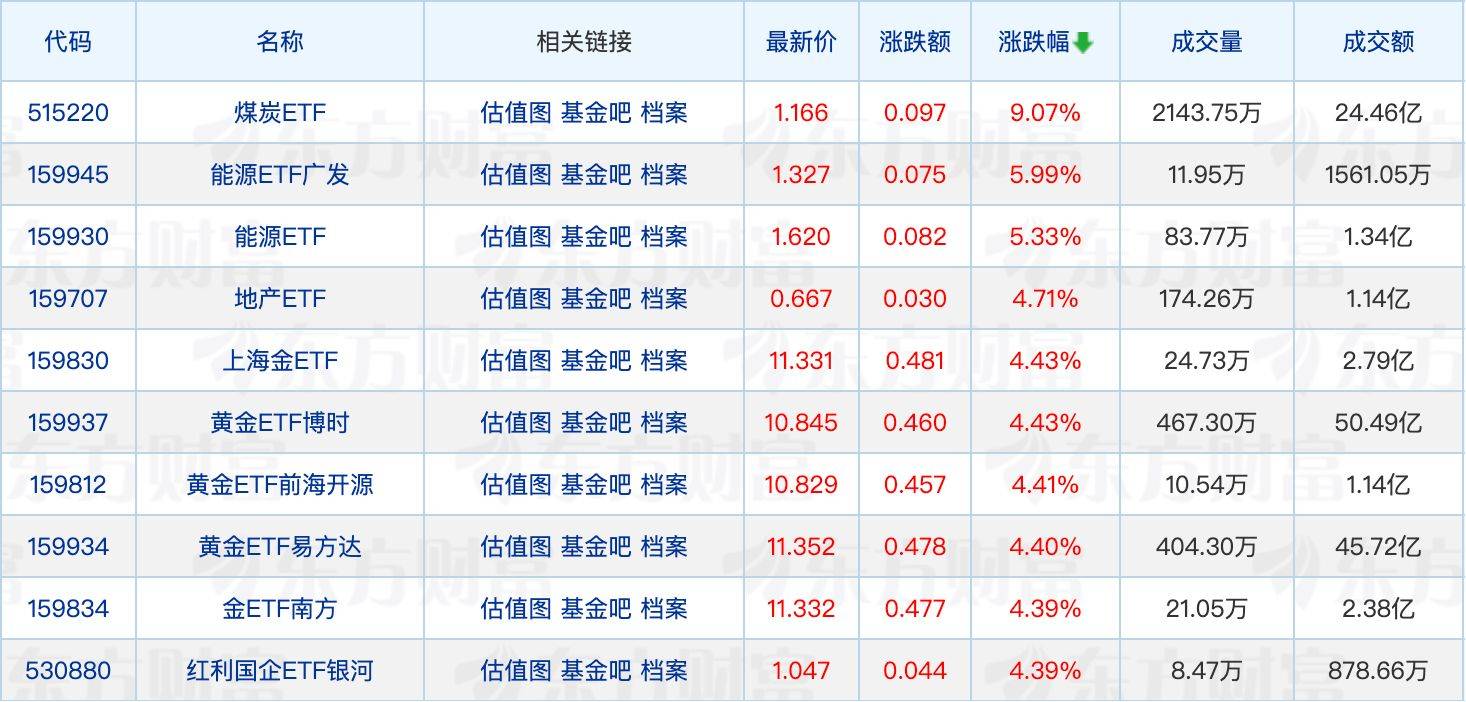 具体来看,煤炭概念掀起涨停潮,超10只个股涨停,陕西黑猫、兖矿能源、中煤能源涨停,煤炭ETF领涨9.07%,两只能源ETF也均涨超5%。