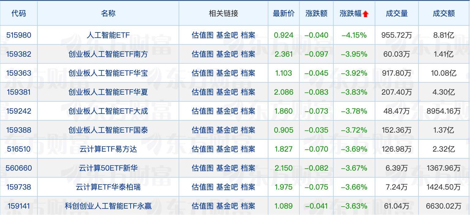 下跌方面,人工智能ETF领跌4.15%,多只创业板人工智能ETF回调居前。