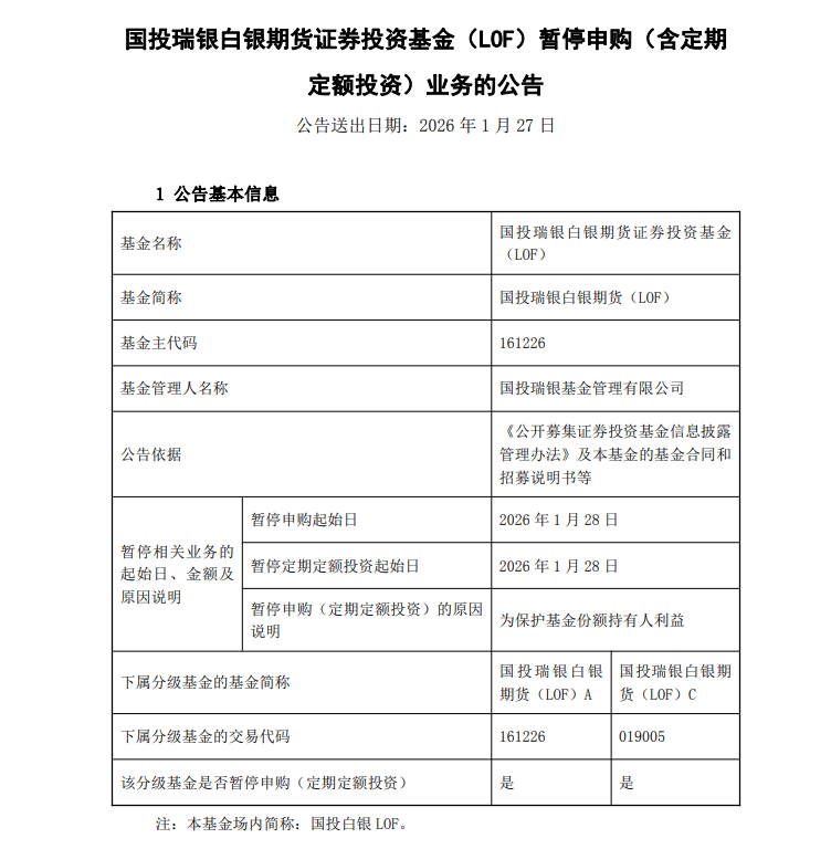 1月26日,国投白银LOF公告,将于1月28日起暂停申购(含定期定额投资)业务。