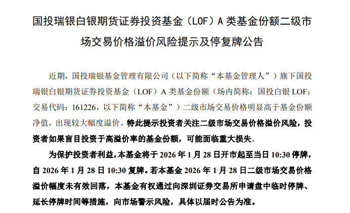 另外,1月27日,国投白银LOF公告,本基金将于2026年1月28日开市起至当日10:30停牌,自2026年1月28日10:30复牌。若本基金2026年1月28日二级市场交易价格溢价幅度未有效回落,本基金有权通过向深圳证券交易所申请盘中临时停牌、延长停牌时间等措施,向市场警示风险,具体以届时公告为准。