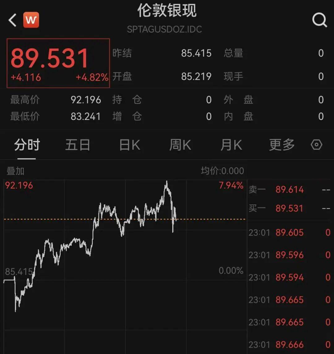 现货白银向上触及92美元/盎司 钛媒体App 2月4日消息,现货白银向上触及92美元/盎司,日内上涨8.23%。(广角观察)