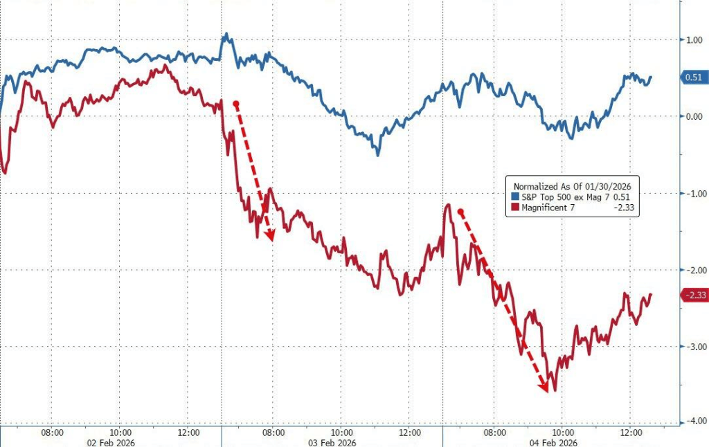与之形成鲜明对比的是,资金持续流向此前被忽视的板块。能源与材料当日领涨标普500,化工板块录得过去十年中第四大的单日涨幅。即便在指数下跌的情况下,标普500中上涨个股数量仍明显多于下跌个股,等权重指数反而上涨,显示“去集中化”的轮动仍在深化。
