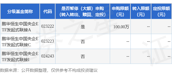 证券之星消息,2月5日鹏华基金管理有限公司发布《鹏华恒生中国央企交易型开放式指数证券投资基金发起式联接基金A类基金份额暂停大额申购、定期定额投资业务的公告》。公告中提示,为保护基金份额持有人利益,自2026年2月5日起鹏华恒生中国央企交易型开放式指数证券投资基金发起式联接基金A类基金份额暂停大额申购、定期定额投资业务,下属分级基金调整明细如下: