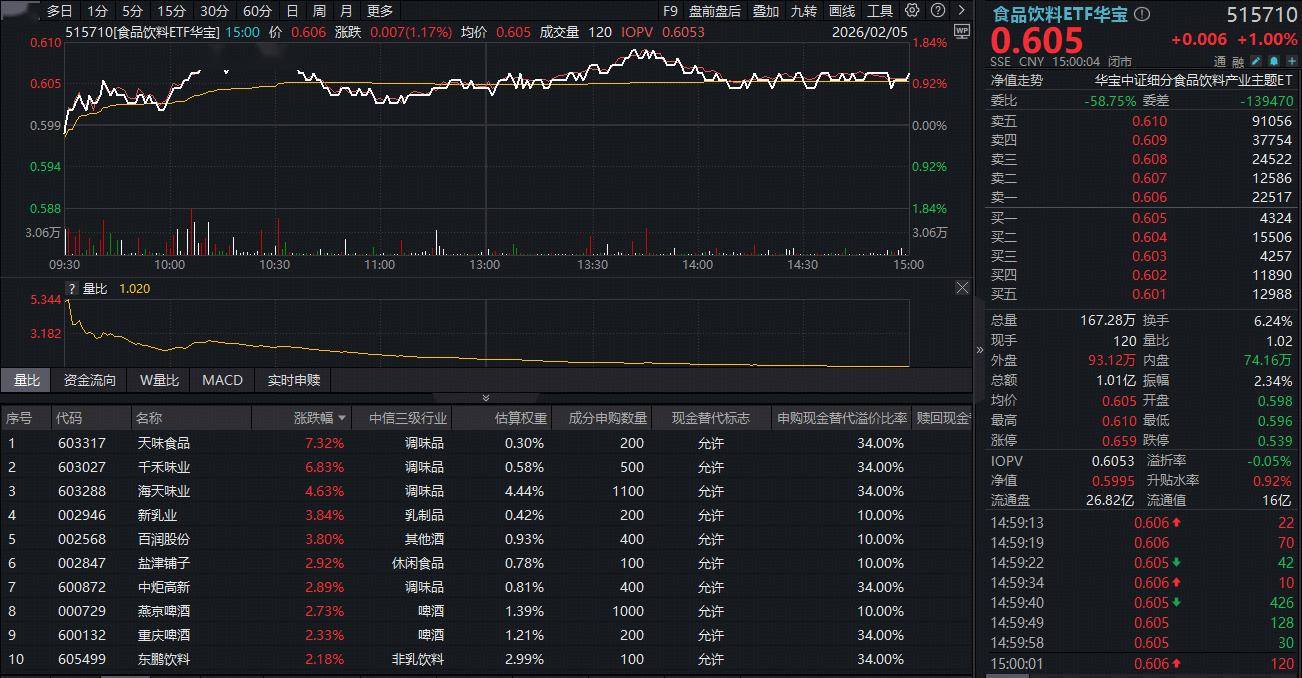 吃喝板块攻势不止!反映吃喝板块整体走势的食品饮料ETF华宝(515710)开盘后迅速拉升,盘中场内价格最高涨幅达到1.84%,截至收盘,逆市涨1%。