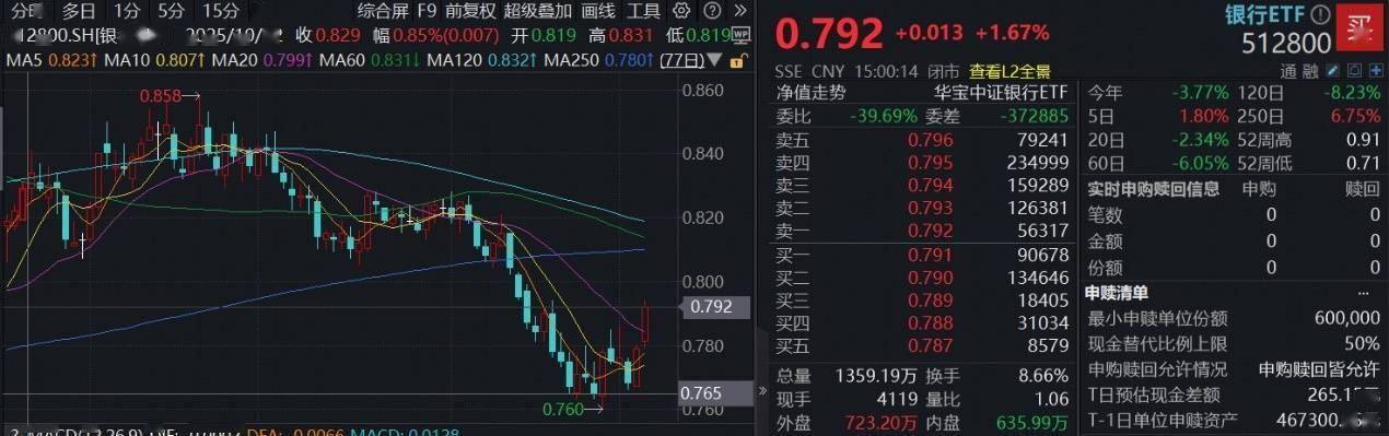 全市场规模最大的银行ETF(512800)高开高走,午后进一步上冲,场内价格一度涨近2%,收涨1.67%,站上20日线,全天成交额10.71亿元,环比放量超3亿。