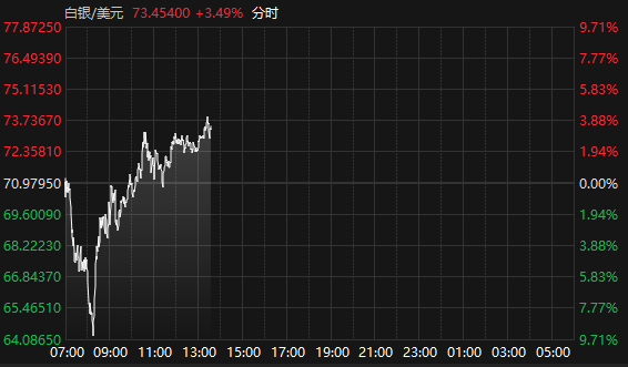 据Choice数据,2月6日,国际现货黄金午后站上4850美元/盎司关口,截至13:36报4854.41美元/盎司,日内涨1.54%;现货白银报73.45美元/盎司,日内涨3.49%。
