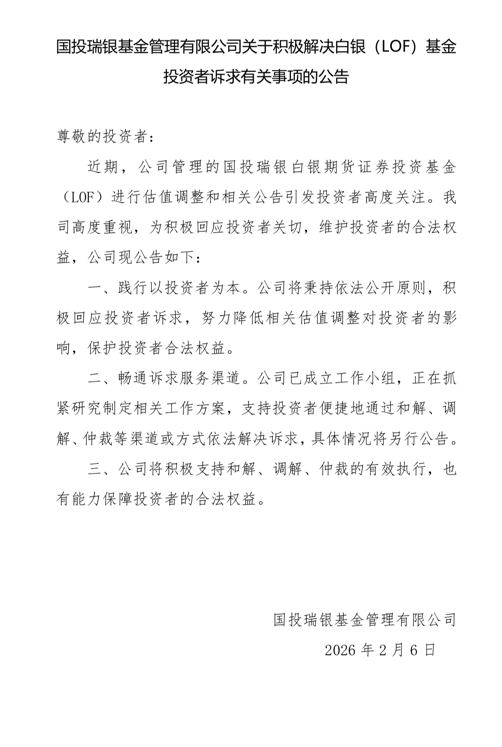【导读】国投瑞银公告:积极解决白银(LOF)基金投资者诉求