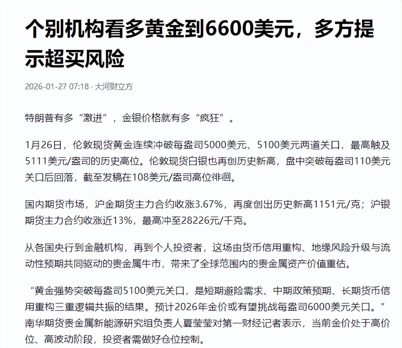 趋势尚未被打断,变量仍在持续发酵。市场真正关心的,已经不是是否会波动,而是在新的全球环境下,黄金会被重新定价到什么位置。6600美元是否会成为现实,时间会给出答案,但可以确认的是,黄金的故事,远未结束。