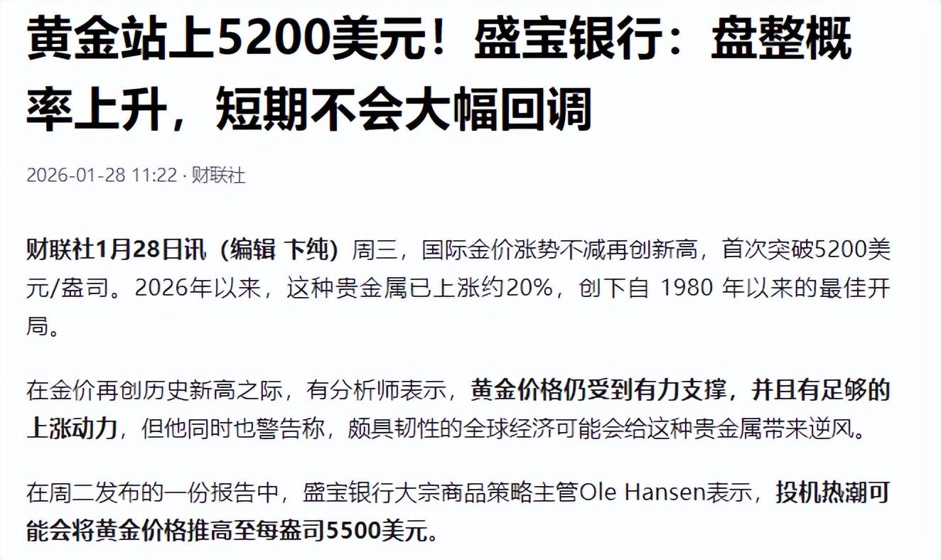 2026年1月28日,现货黄金价格首次突破5200美元/盎司。