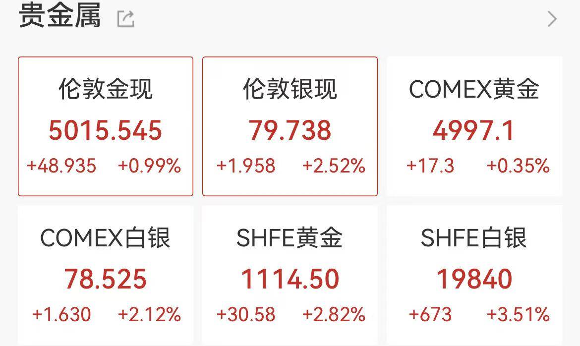 【大河财立方消息】2月9日,现货黄金、白银表现出反弹态势。截至发稿,现货白银日内涨超2%,报79.74美元/盎司。现货黄金日内涨幅扩大近1%,报5015.55美元/盎司。