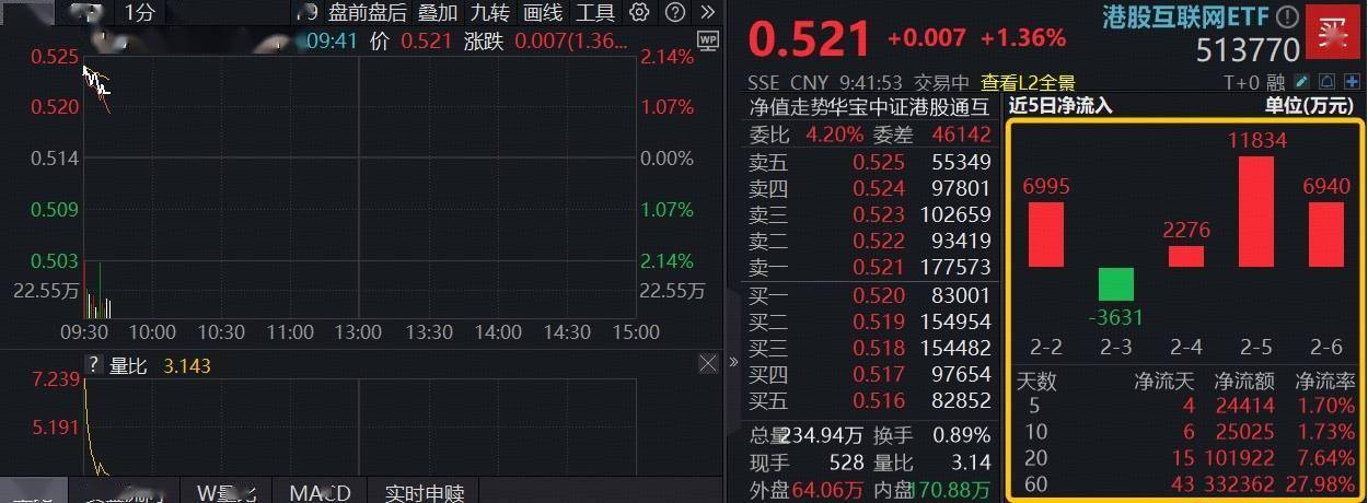 值得一提的是,港股互联网ETF(513770)近来吸引资金密集涌入,上交所数据显示,港股互联网ETF(513770)近5日累计获资金净流入2.44亿元。