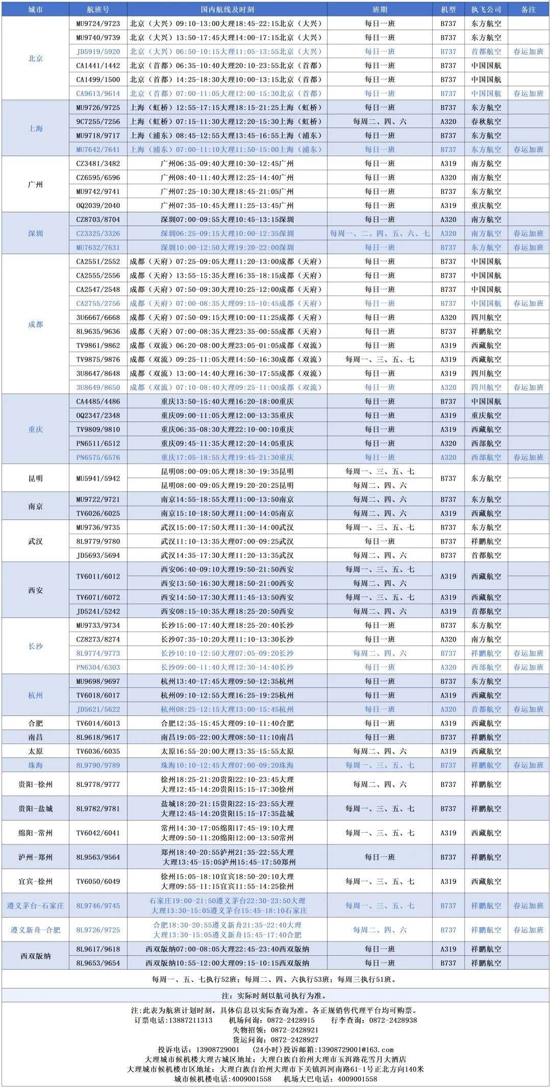 1. 本次航班时刻表为计划时刻,实际运行以各航空公司官网及大理机场官方通知为准。