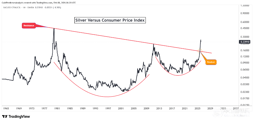 下图显示,白银与CPI的比值已突破长达40年的下行趋势。白银形成了经典的杯柄形态:杯体部分形成于1980年至2011年,柄部则构筑于2011年至2025年。这一形态代表了数十年的蓄势过程。2025年的突破发生在白银最终冲破自1980年以来长期压制价格比值的阻力线之后。